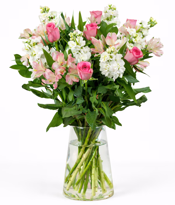 Blushing Love is a beautifully soft bouquet featuring dusky pink roses, delicate alstroemeria and elegant white stocks. The gentle pink tones create a romantic and effortlessly stylish display.