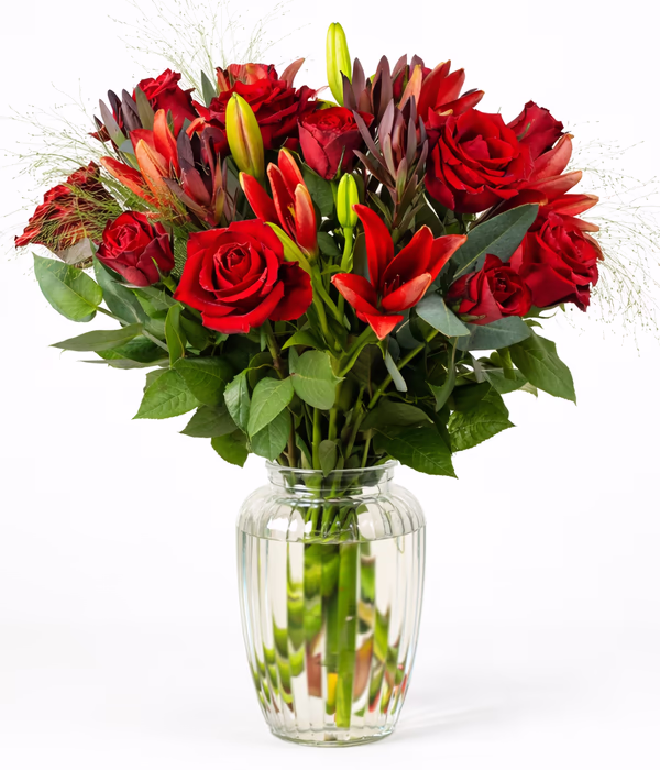 Burning Romance is a striking Valentine’s bouquet featuring red lilies, red roses and ever red roses, creating a bold and dramatic display. Accented with safari sunset blooms, eucalyptus and fountain grass, this arrangement is rich in colour and full of romance.