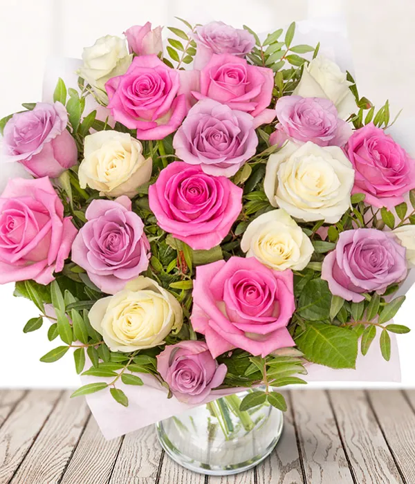 A beautifully fragrant bouquet of mixed cream, mauve and delicate pink roses. All sent in bud, simply arrange the flowers into a vase of water and flower food and after 24 - 48 hours the roses will bloom. Sent via tracked courier delivery in a specially designed secure Eflorist box. This beautiful bouquet will bloom in their home, making it the perfect gift to brighten their day.