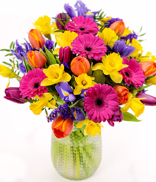 A perfect mix of spring blooms, bringing together purple and orange tulips, cerise germini and cheerful yellow daffodils, finished with blue iris, statice and fresh pistache. Bursting with colour and seasonal charm, it’s a match made in heaven. Your flowers are delivered fresh in an Eflorist box, carefully packed to protect them on their journey. Arriving in bud for longer-lasting enjoyment, they’re easy to arrange at home, simple to care for, and chosen for their quality and freshness. A bright seasonal favourite along with free chocolates that delivers excellent value for money.